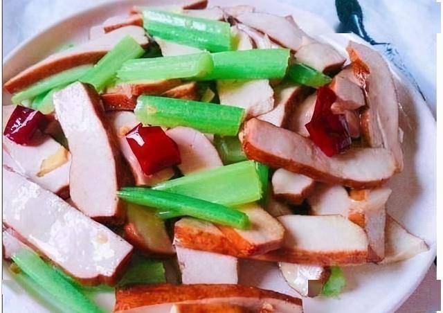 4、下入豆腐干,炒干水分,下入芹菜,盐,鸡精炒制入味即可。