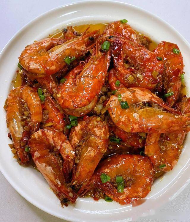 5、出锅前可撒上适量葱花点缀,香味浓郁的蒜蓉大虾即可装盘上桌,热食口感最佳。
