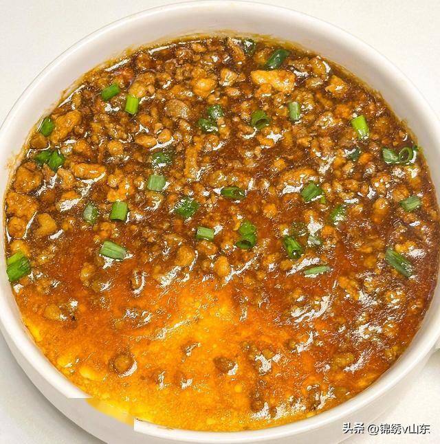 7. 将炒好的肉末铺在蒸好的蛋羹上,淋上少许香油,撒上葱花即可。