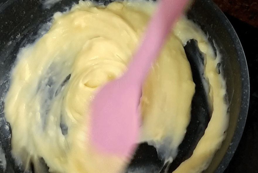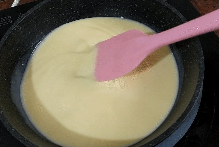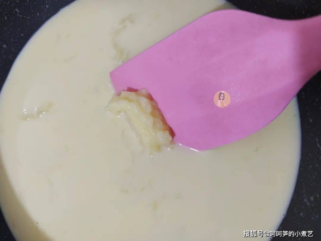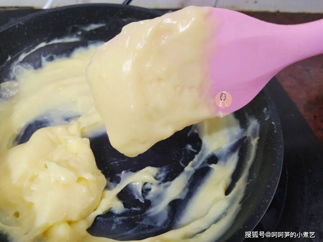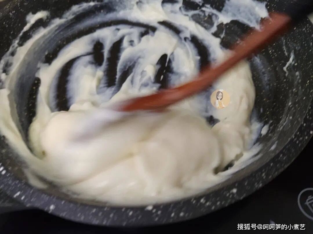 记得加热过程中要不停搅拌。一定不要心急开大火,否则做好的麻薯口感不顺滑,会如死面疙瘩一样。