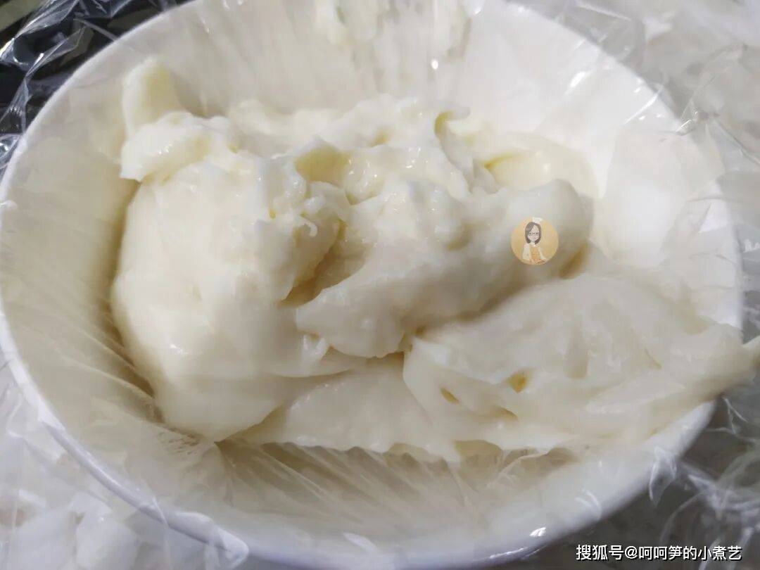 将煮好的麻薯倒入碗内,用保鲜膜包住,室温晾凉后送入冰箱冷藏30分钟左右。