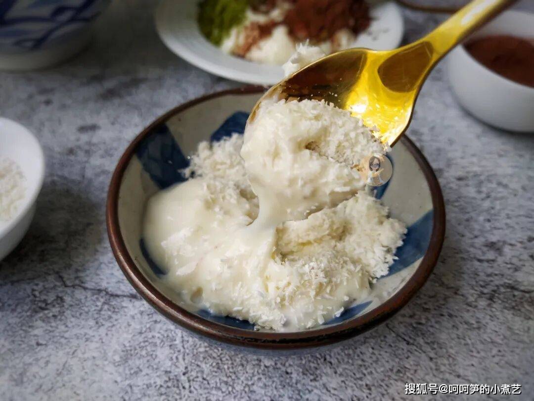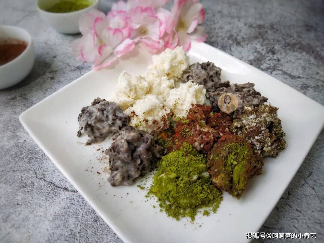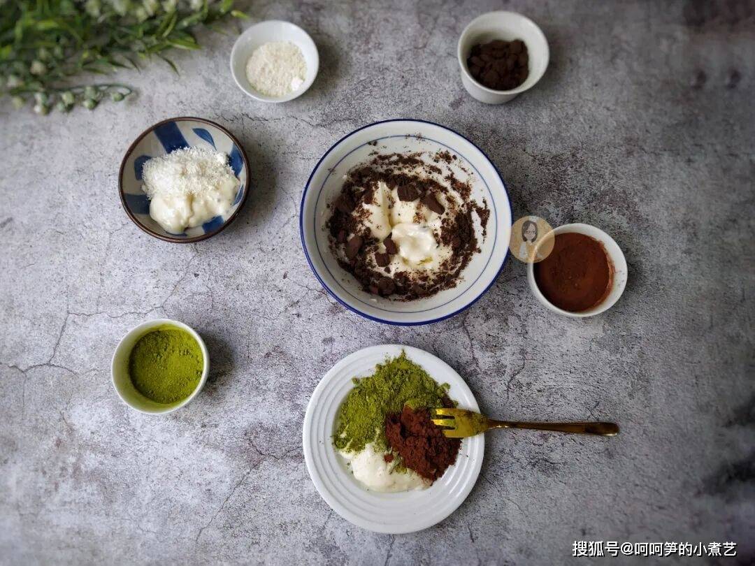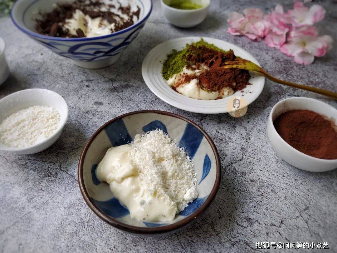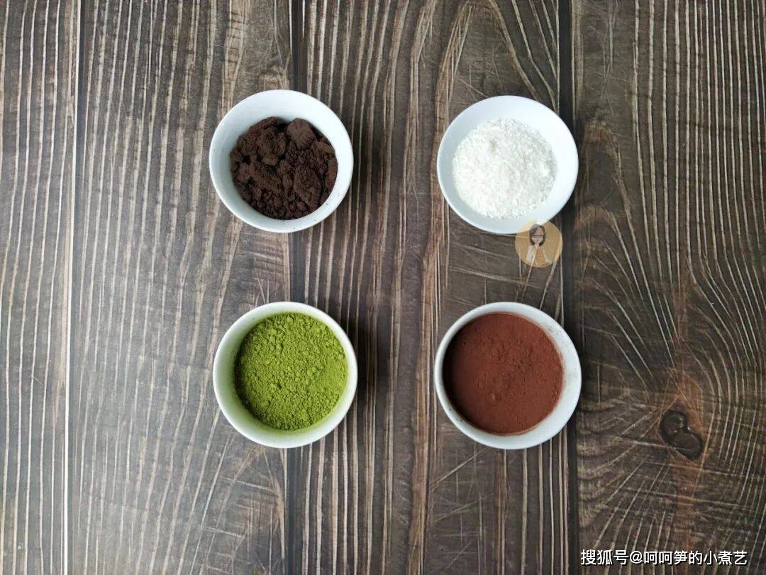 准备好自己喜欢的蘸料,这里笋笋准备了可可粉、抹茶粉、椰蓉、奥利奥碎。