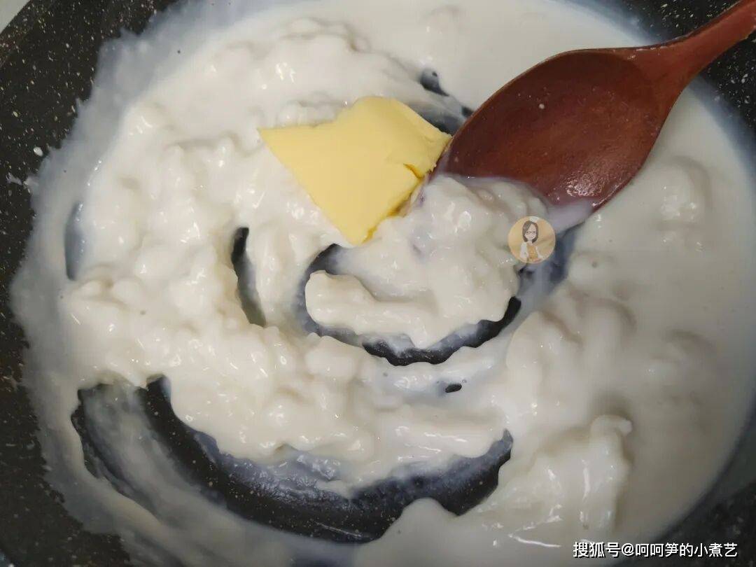 当锅中液体开始微微结块时加入软化的黄油。黄油主要是增加麻薯的奶香味,让做好的麻薯口感更加滑嫩。