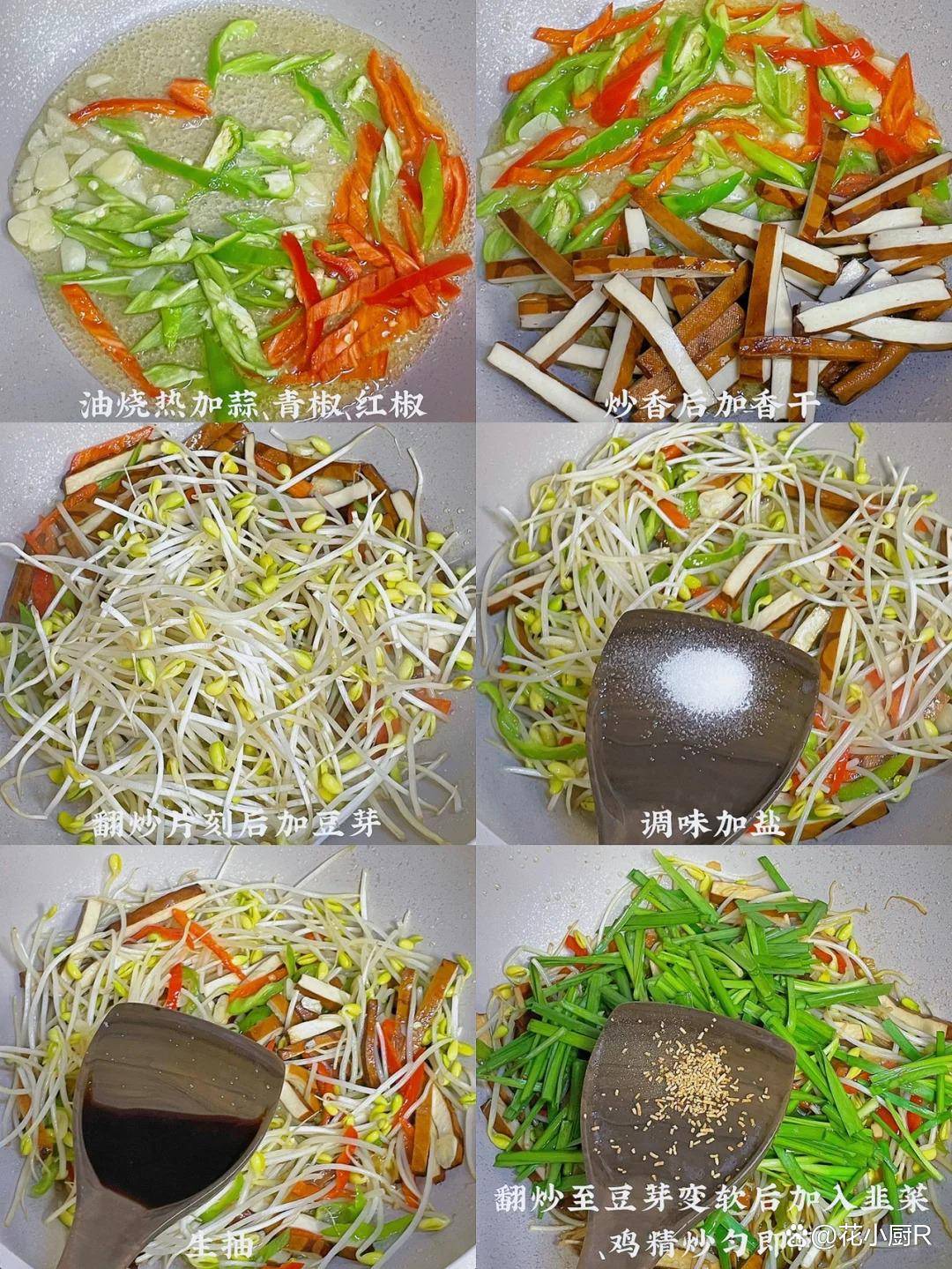 3️⃣油烧热加入蒜、青椒、红椒(喜欢辣的可以换成小米辣),炒香后加入香干,翻炒片刻后加入豆芽、盐、生抽,继续翻炒至豆芽变软后加韭菜、鸡精翻炒均匀即可。