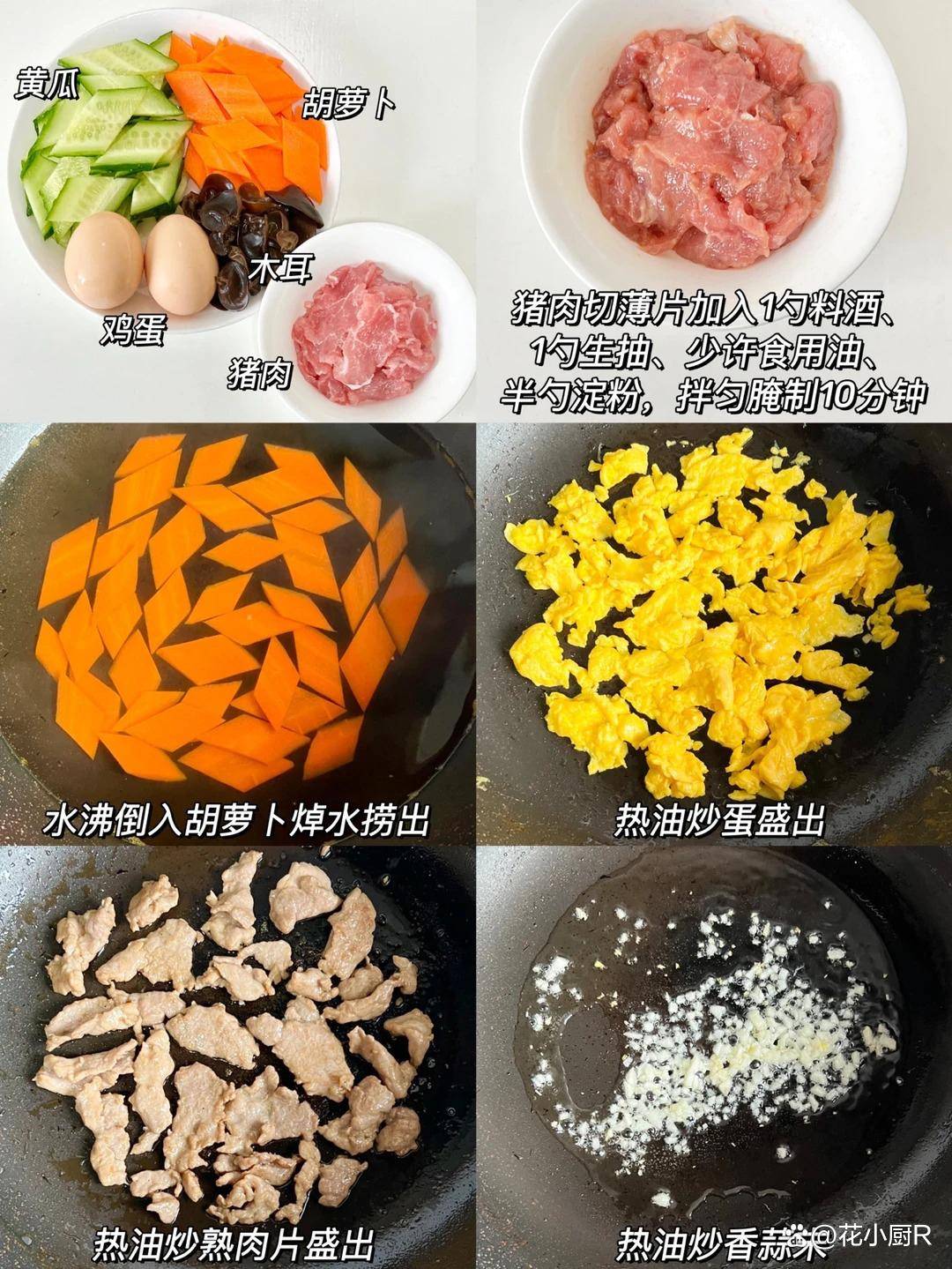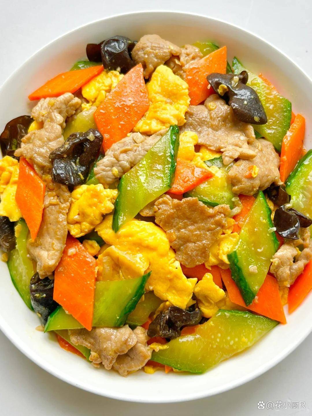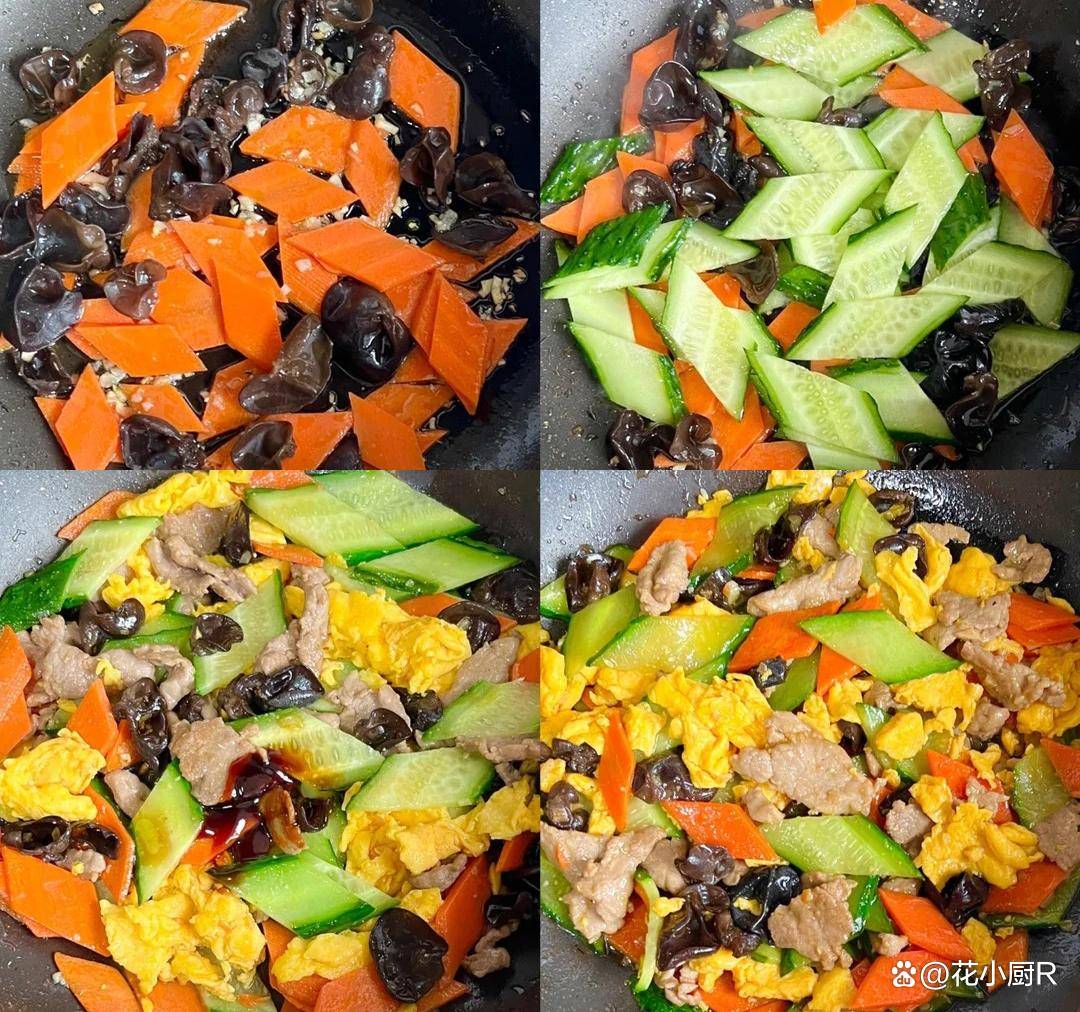 4️⃣热油炒香蒜末,倒入胡萝卜和木耳翻炒,再倒入黄瓜翻炒,倒入炒蛋和肉片,加入适量盐、生抽、蚝油,倒入少许水淀粉翻炒收汁。