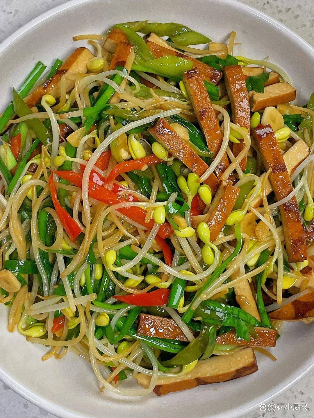 韭菜香干炒豆芽的亮点在于“脆、软、香”三层口感:豆芽爽脆,香干软韧,韭菜辛香。大火快炒后,豆芽的汁水裹住香干,韭菜的香气渗透其中,清爽不油腻,下饭又解腻。