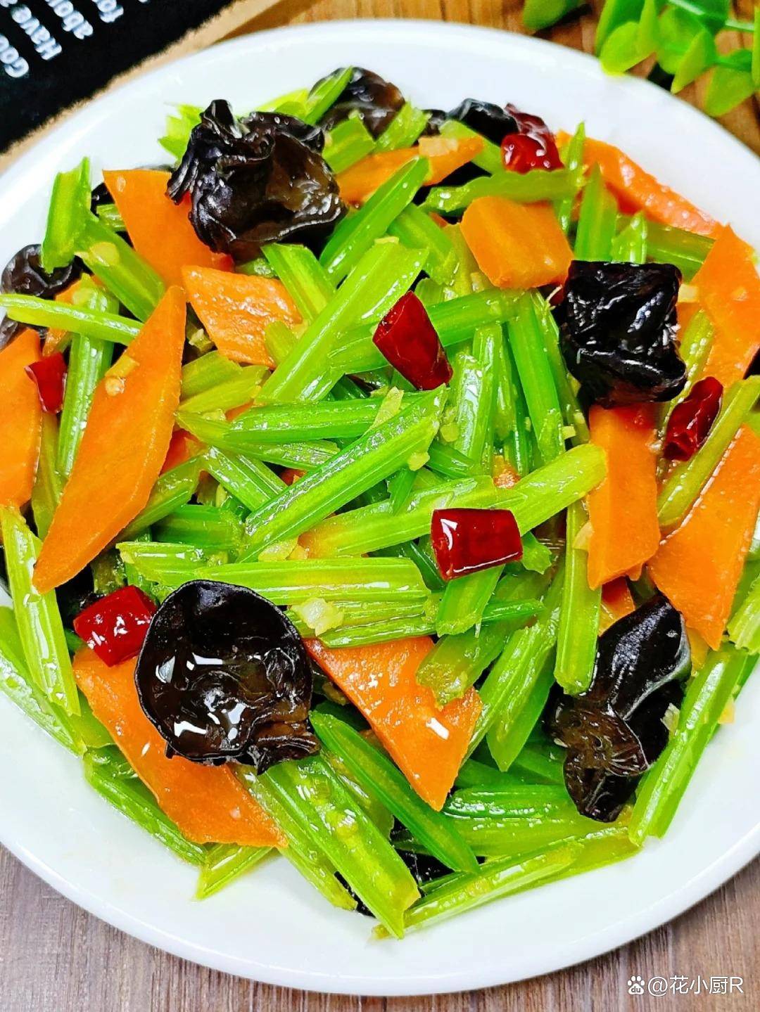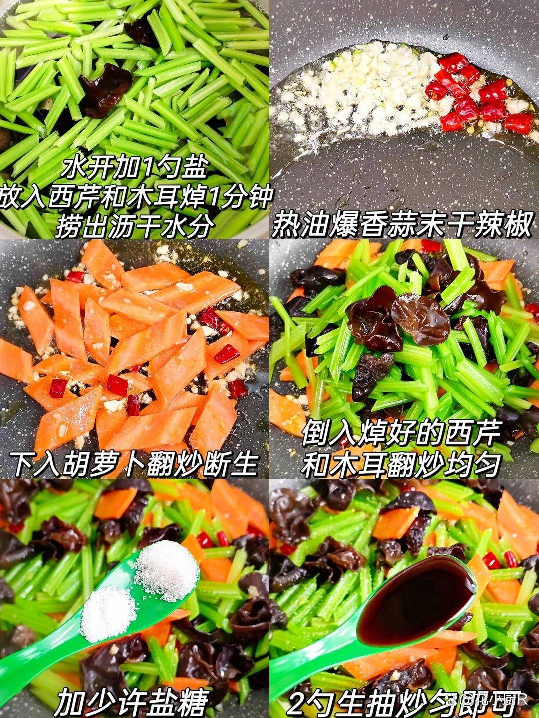 2️⃣起锅热油爆香蒜末和干辣椒,下入胡萝卜翻炒断生,倒入焯好的西芹和木耳翻炒均匀,加少许盐糖、2勺生抽炒匀即可。