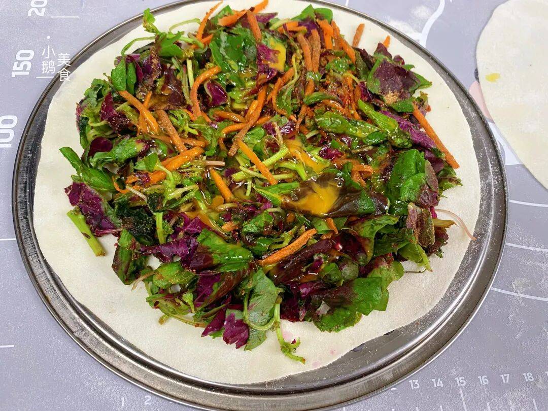 4,加适量盐、鸡精、花椒粉和香油,拌匀备用。如果手速慢,建议一次只调一张饼的量,这样馅料不出水,还能根据家人口味,调整配菜和味道。