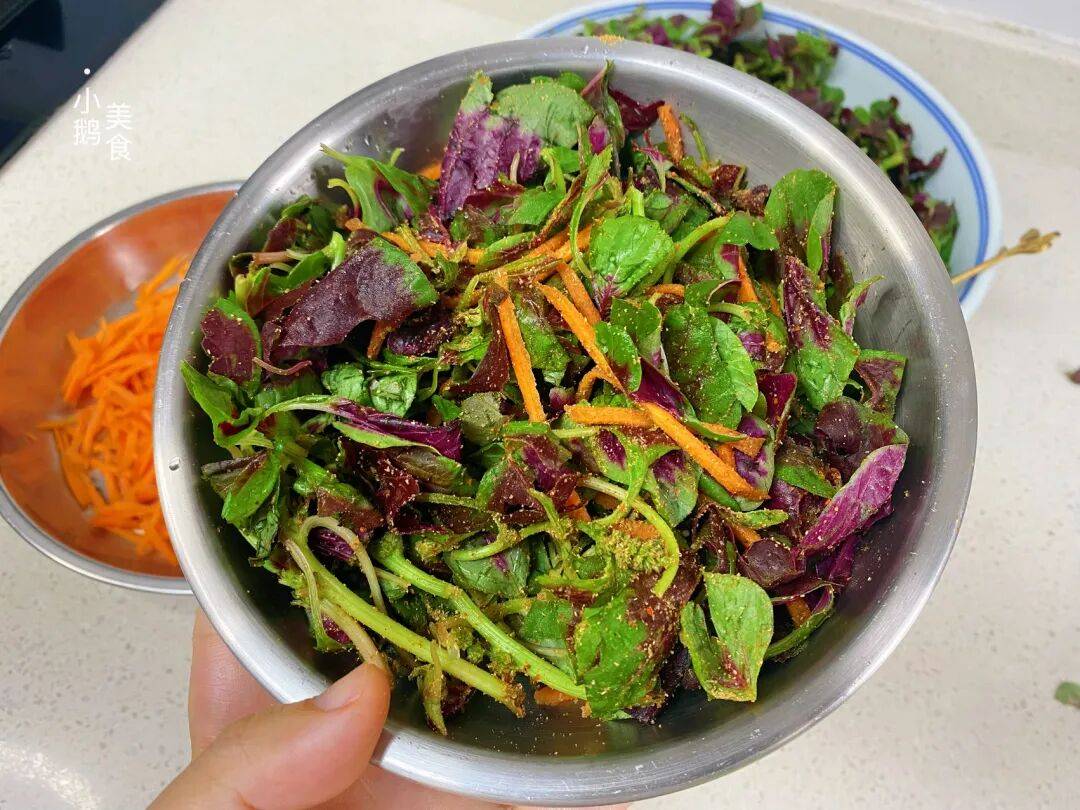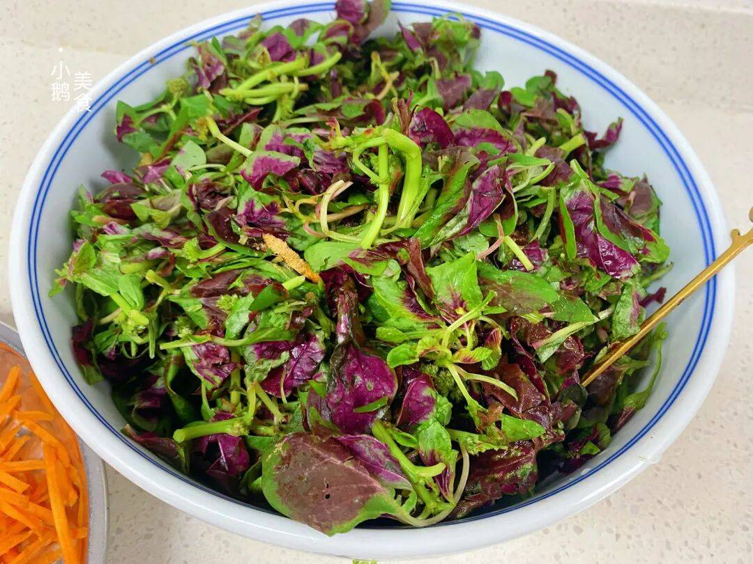 3,苋菜昨天晚上洗净控干的,再切短一些。用菠菜和韭菜也好吃。擦点胡萝卜当配菜。
