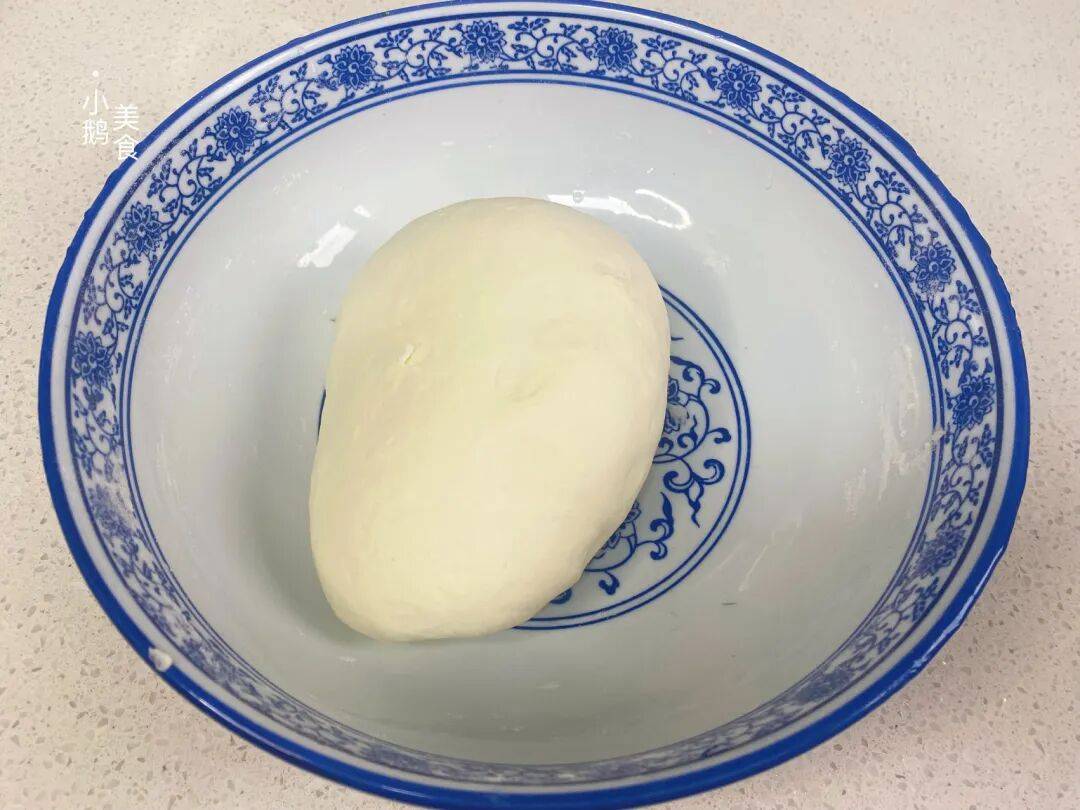 1,和面。400克普通面粉,220克有点烫手的热水,搅成面絮,揉成偏软面团,盖盖醒5分钟,就可以把面揉光滑了。盖盖备用。