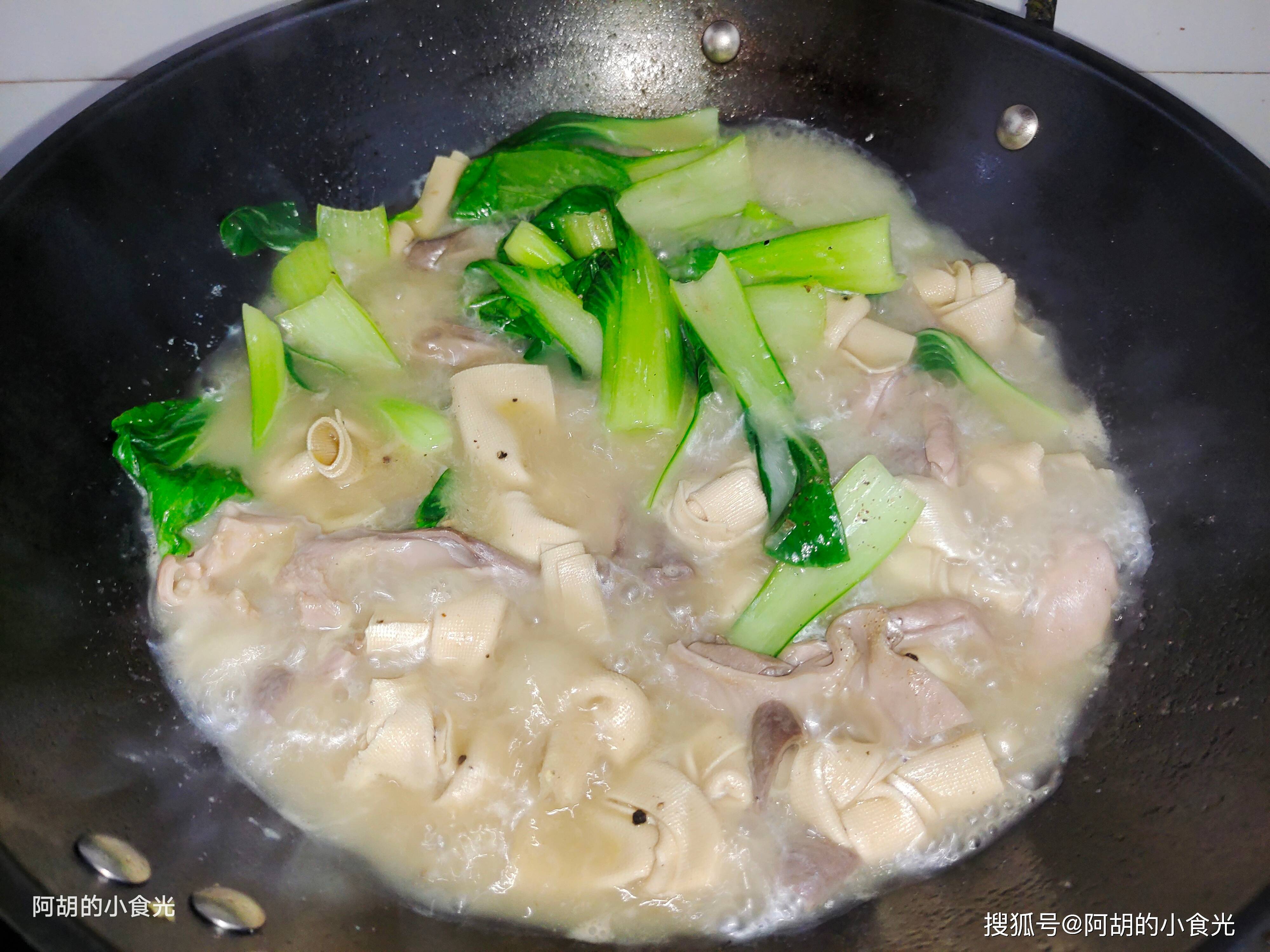 第六步:最后把青菜倒入锅中,翻拌均匀后再撒入一些黑胡椒粉或者粗一些的黑胡椒碎,激发出香味后就可以出锅装盘了。有汤有菜的,汤汁也是特别鲜美开胃,尤其是脆嫩的猪肚条,和嫩而又有口感的千张结,春天来上这一锅,滋补鲜美又开胃,感兴趣的一定要试一试这个做法。