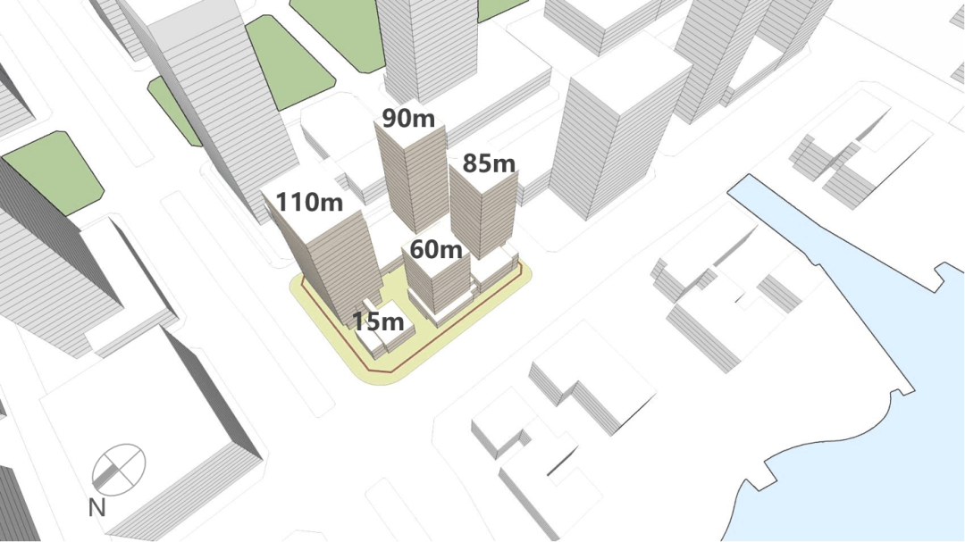天际线与视野优化:天际线设计极具层次感,从3层旗舰店起步,依次升高至主塔楼110米,形成独特视觉标识。