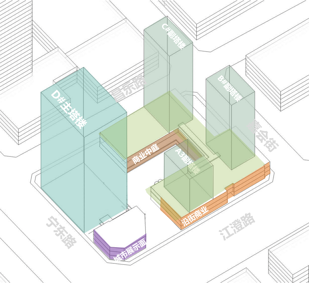 立体交通与人流引导:行人和车辆分流,确保安全高效。西北角为主要人行入口,结合旗舰店和绿地打造仪式感入口形象。办公楼设有两个落客区,方便不同人群快速通勤。商业人流通过裙房底层架空、内庭院和商业中庭有序引入各个商业区域。