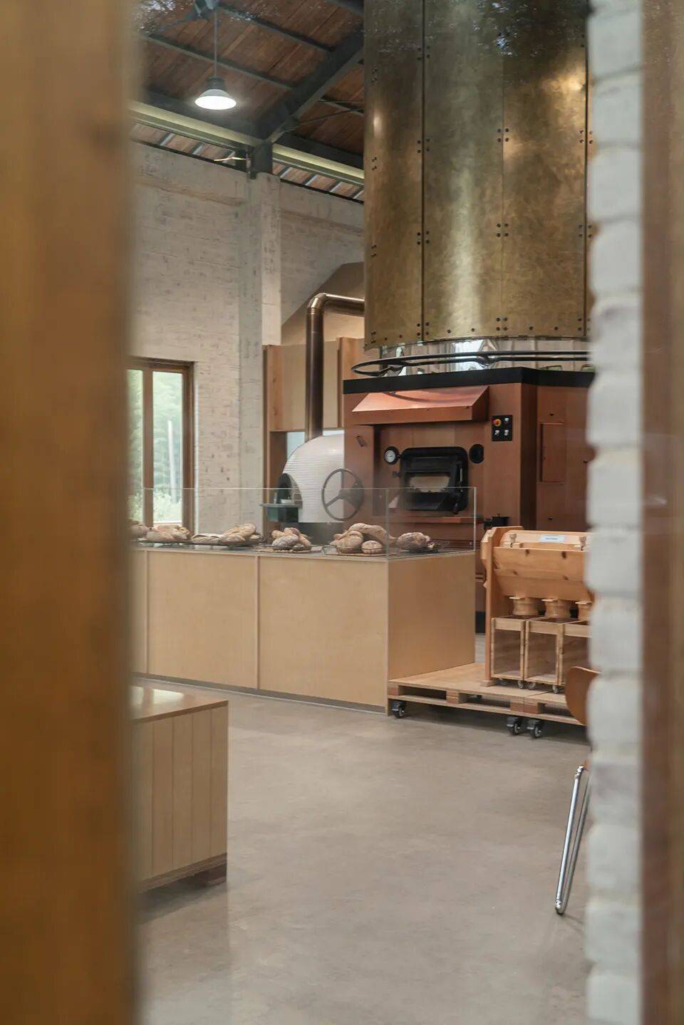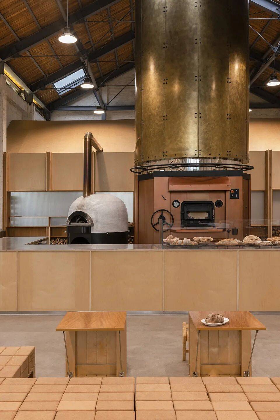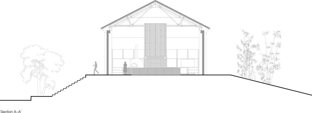 石窑烤炉的核心地位:烤炉高度提升至6米,垂直延伸至天花底部,成为空间核心装置,与室外景色共同构成空间焦点。
