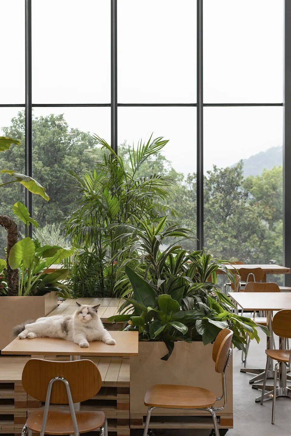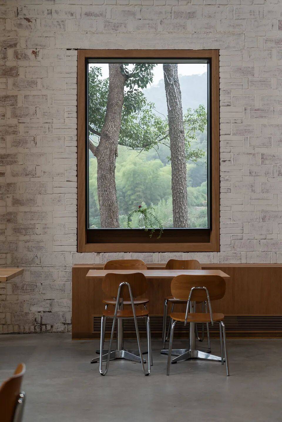 功能分区的顺应地势:西侧面向竹林,空间封闭,整合为后厨及辅助功能区;东侧通高玻璃幕墙,正对开阔景观,设置为就餐区域,实现室内外最大程度联系。