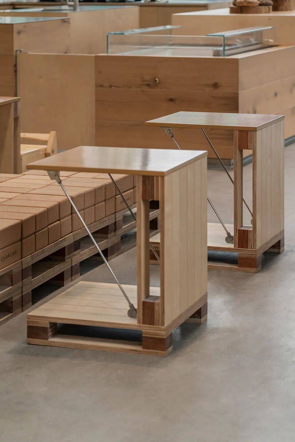 模块化与可重复利用:部分家具与装置基于木托架模块衍生,结合软木瑜伽砖设计成可移动座凳,满足使用需求并具备重复利用可能性,延续材料生命周期。