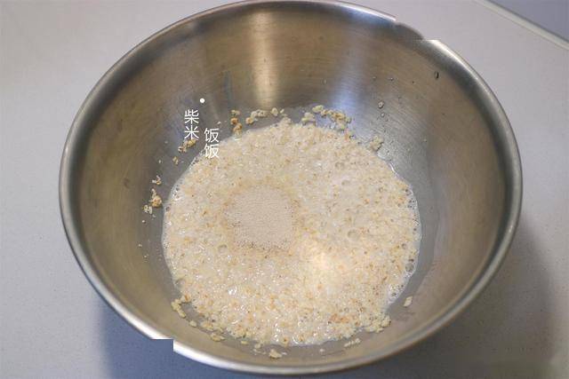 1,两包燕麦片(60克),加220克热水搅拌泡软。晾到不烫手了,加3克酵母拌匀。