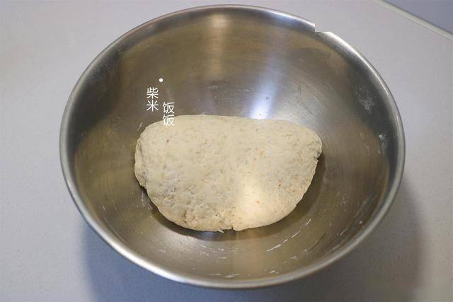 2,加入300克面粉,揉成一个稍微偏软一点的面团。密封醒面20分钟,夏天可以醒面15分钟。不用等面团发到两倍大。