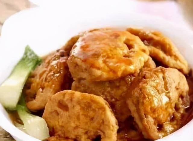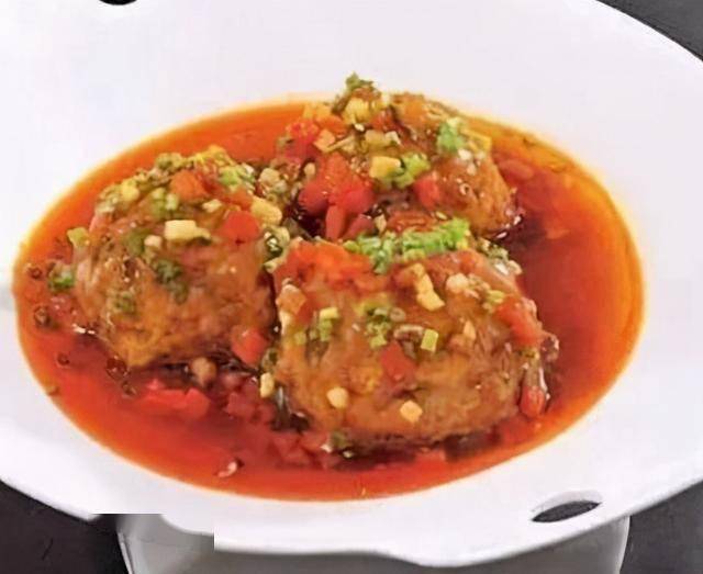 2、另起净锅,下入高汤,加入狮子头用小火炖2小时,淋剩余调料制成的鱼香汁即成。