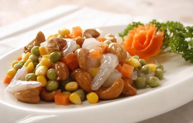 材料:虾仁250克、鲜香菇6朵、玉米200克、胡萝卜1小根、豌豆100克,腰果100克、葱末1茶匙(5克)、姜末1茶匙(5克)、蒜末1茶匙(5克)、盐1茶匙(5克)、料酒1汤匙(15ml)、淀粉1汤匙(15克)、酱油1汤匙(15ml)、鸡粉1/4茶匙(1克)、糖1茶匙(5克)、香油1/4茶匙(1ml)