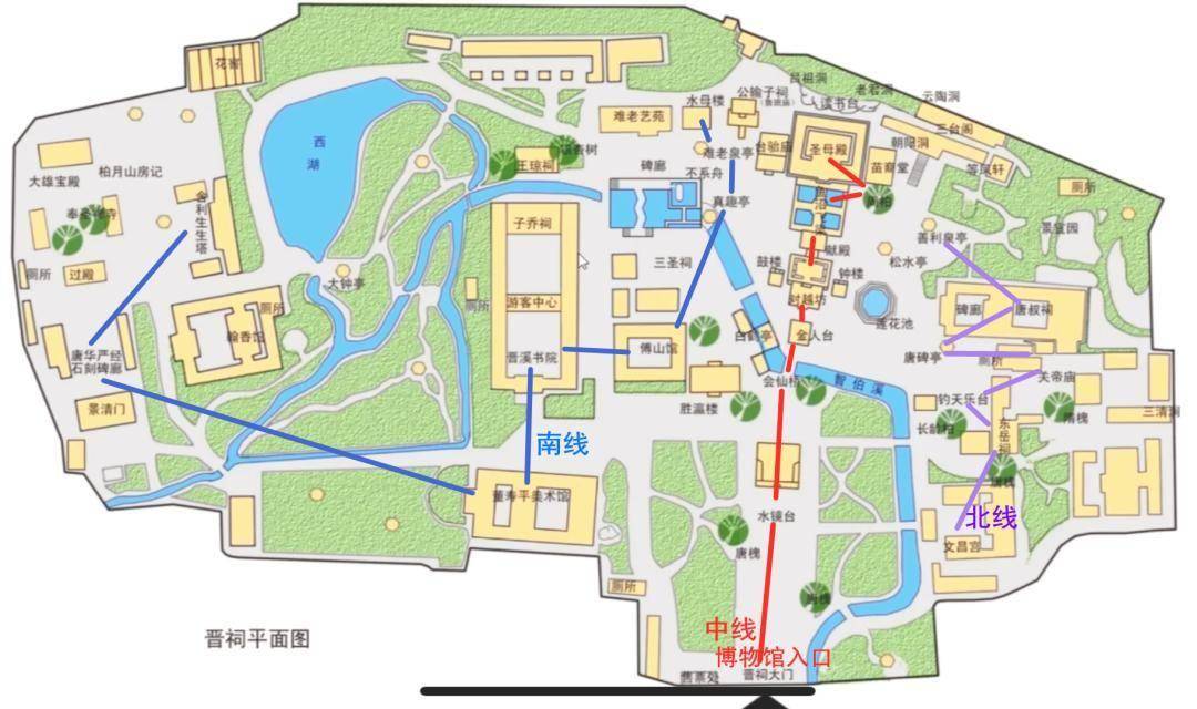 晋祠博物馆导览图,蓝色是南线,红色是中线,紫色是北线(后拖动页面可放大)