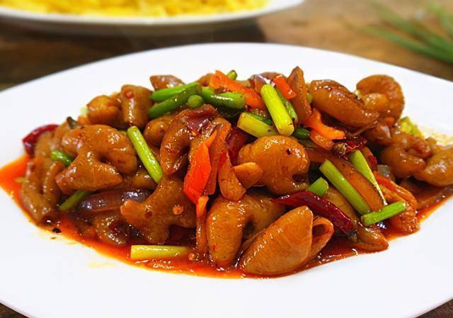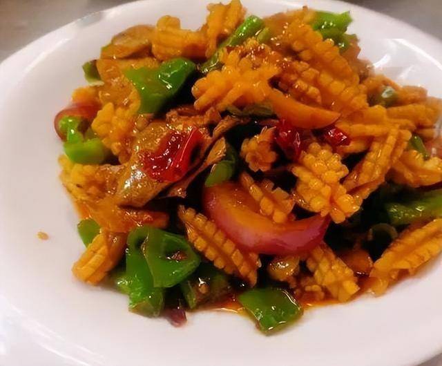 4、加入料酒、生抽、糖和适量的盐翻炒均匀。5、放入适量的清水烹制,烧至汤汁块干时放入青椒翻炒均匀。6、淋入适量的水淀粉勾芡,再加入少许鸡精淋入香油翻炒均匀即可关火。