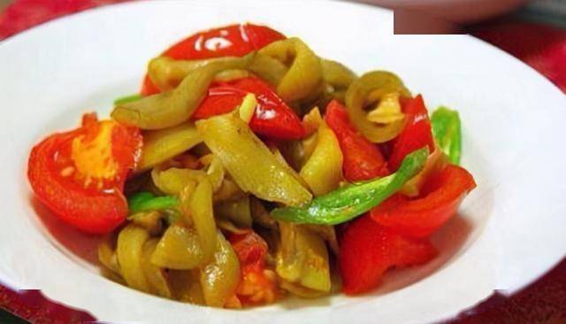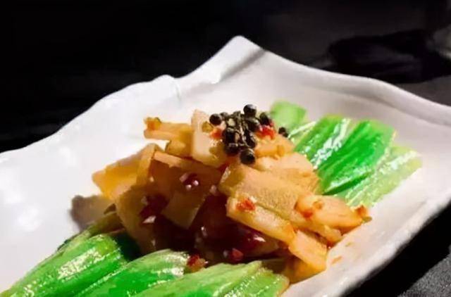 3、盖菜清炒一下,加入盐、味精、白糖,一点点淀粉勾芡,翻匀摆放在盘底。