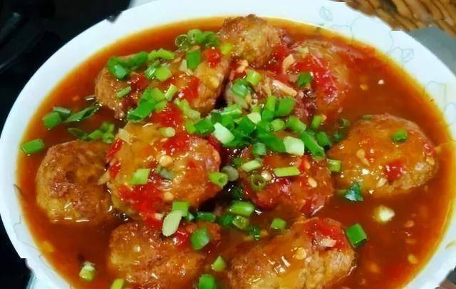 3.锅中留适量油,下入蒜末、泡椒末炒出油红味香;再下入藕丸,加盐、糖醋汁、翻炒匀,加入鲜汤、料酒烧至收浓汤汁,加入盐,水淀粉推匀出锅,撒上葱花,上桌
