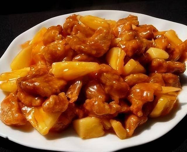 5、入水淀粉勾芡,入炸好的里脊、少许菠萝丁(1/6个菠萝提前切丁备用),大火翻炒至里脊充分蘸满糖醋番茄汁后,放少许麻油即可出锅。