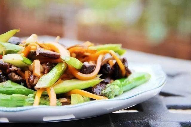 5、锅烧热,倒点橄榄油,油热,放蒜片炒香;加胡萝卜和香菇,翻炒一会儿;加芦笋,适量盐,翻炒一会儿;稍微加点水,继续翻炒,芦笋会慢慢变翠绿,水会慢慢收干,加点干贝素,翻炒均匀,就好啦,起锅~