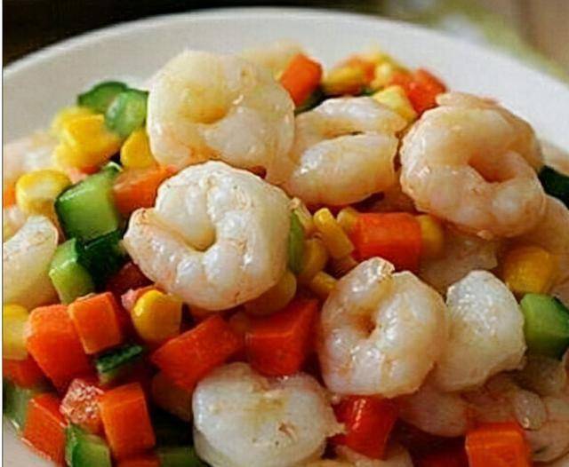 食材:虾仁350g;黄瓜30g;胡萝卜30g;玉米粒30g;油1大勺;盐1小勺;白酒1小勺;淀粉2小勺
