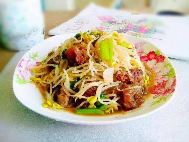 3、汤汁一烧开,加进味精和绿豆芽,颠翻均匀,淋入香油,出锅即可食用。