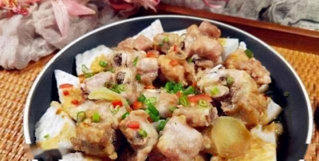 2、排骨处理:买回来的排骨剁成小块,用水清洗干净,沥干水。准备一个大碗,把排骨放入碗中。加入半勺白糖(提鲜),半勺花生油(让排骨肉质滑嫩),加几片姜(去腥)搅拌均匀后放冰箱冷藏3-4小时。出冰箱后,下锅蒸之前15分钟。放入1小勺胡椒粉,蒜末,米酒搅拌,加1勺生抽调味。最后撒上淀粉水,搅拌均匀。撒淀粉水目的是锁住排骨里面的味道和水分。