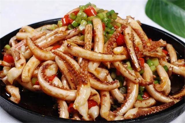 2、将锅置于火上,加入猪油烧于六七成热时,放入切好的鱿鱼丝,急速煸炒,见鱼肉变色时下入葱丝同炒几下,随即加入料酒、盐和少量鲜汤;