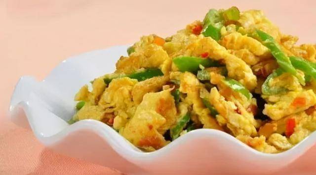 4.放下青椒碎加大火力翻炒一下,放入鸡蛋黄混炒,根据各人口味下盐、糖、生抽调味后装盘即可。