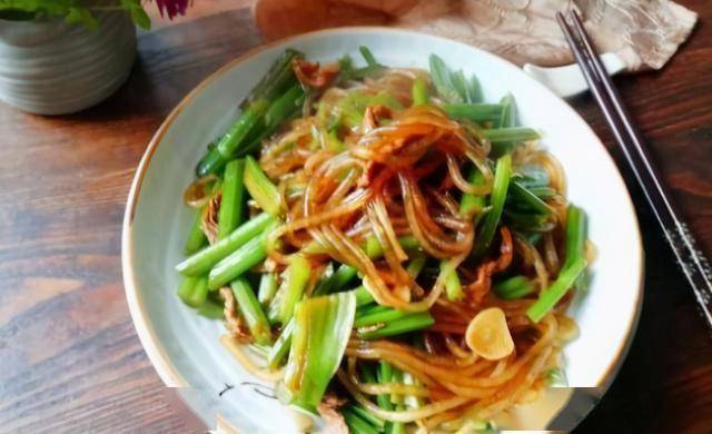 材料:芹菜、粉条、猪肉、油、盐、葱、姜、大蒜、酱油、料酒