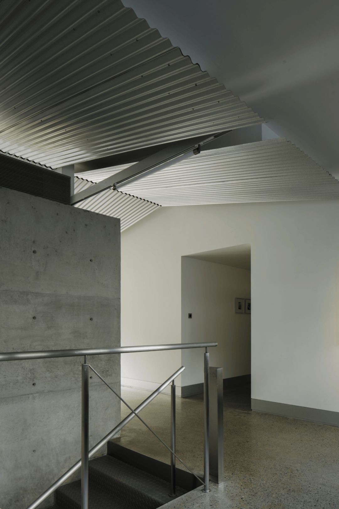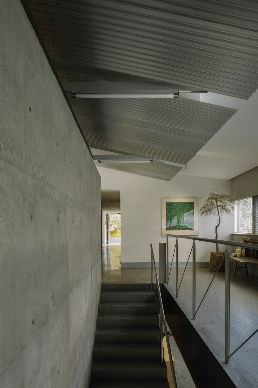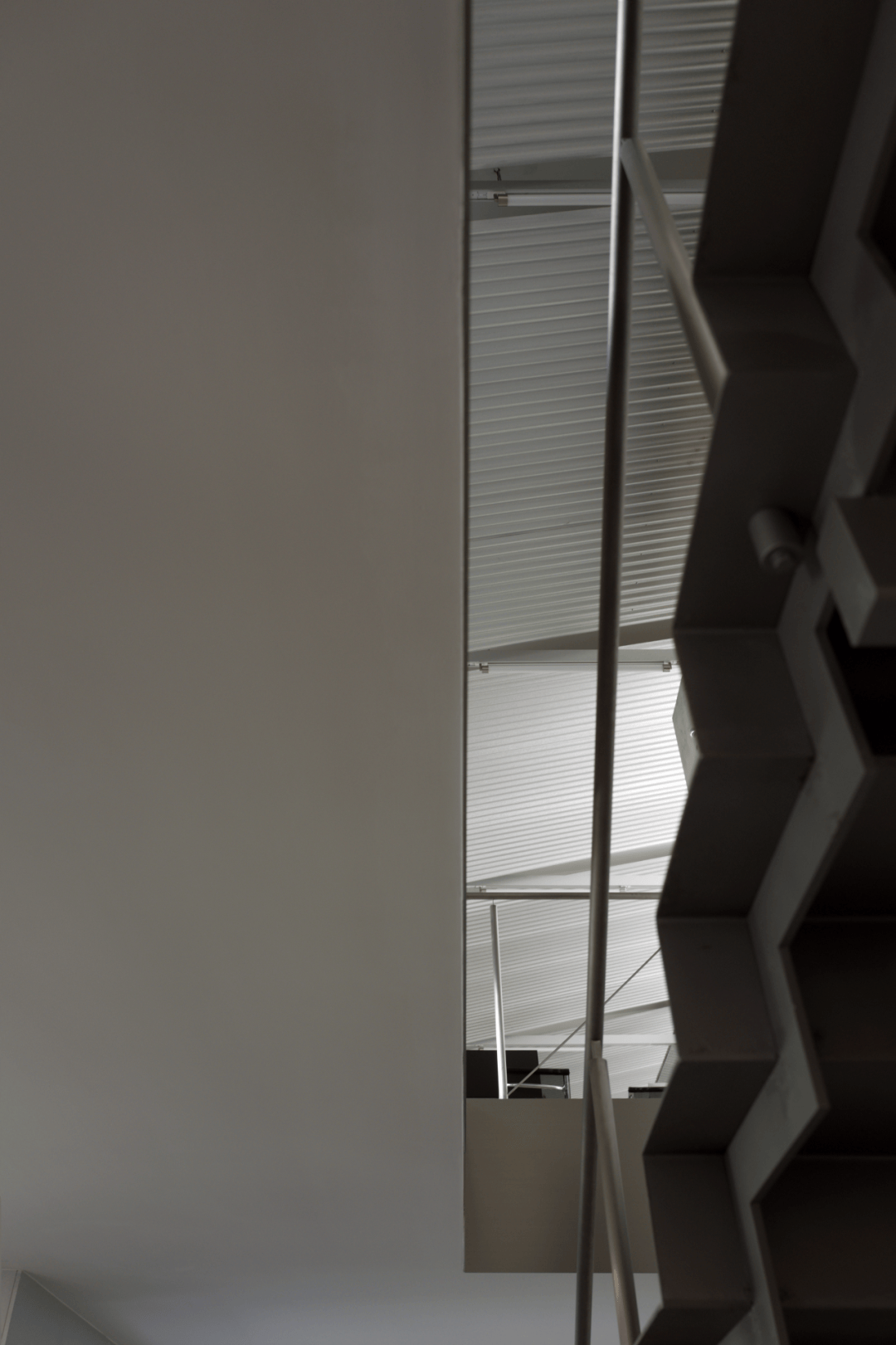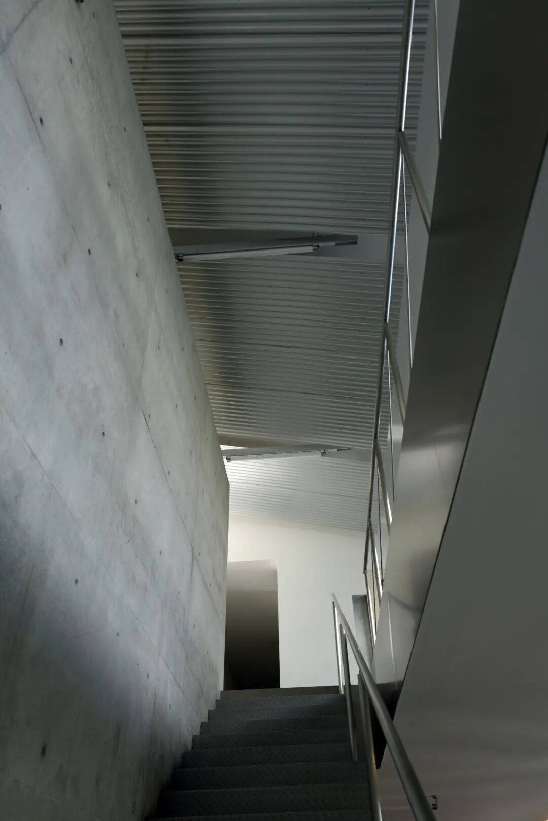空间组织上,强调水平方向的贯通与流动性。垂直方向上下两层通过室内楼梯连接,楼梯不仅作为空间转换的节点,更如雕塑般存在于空间之中。视线在行进过程中先被压缩,而后在豁然开朗处得到释放,最终到达情感的高峰,这种空间体验给人带来丰富的心理感受,使人在建筑中穿梭时仿佛经历一场心灵的旅程。