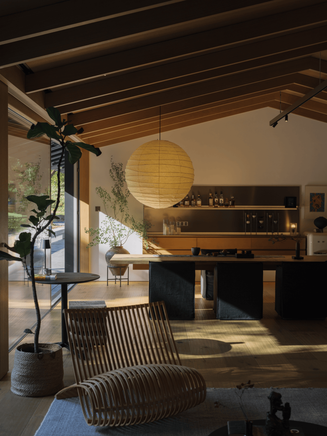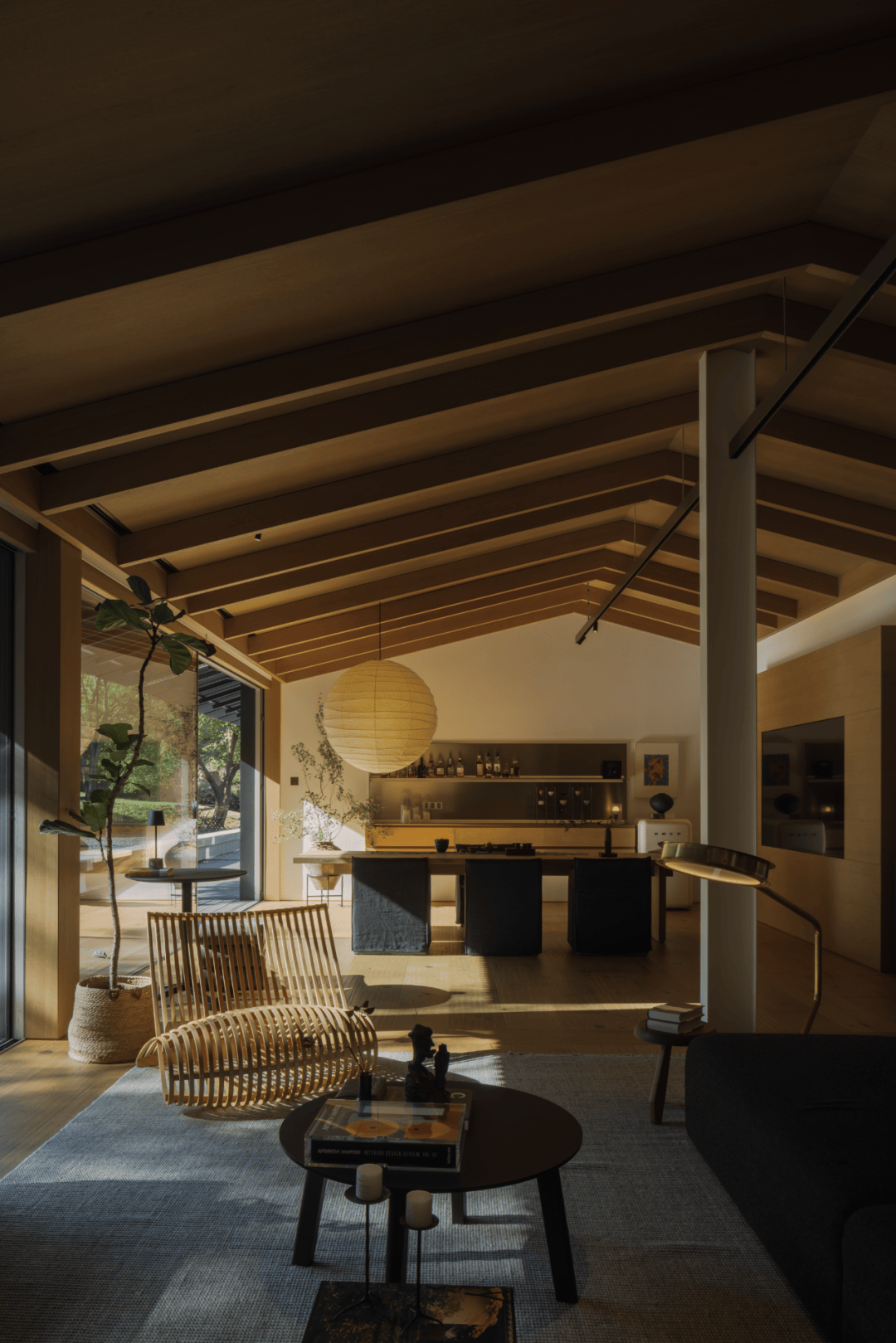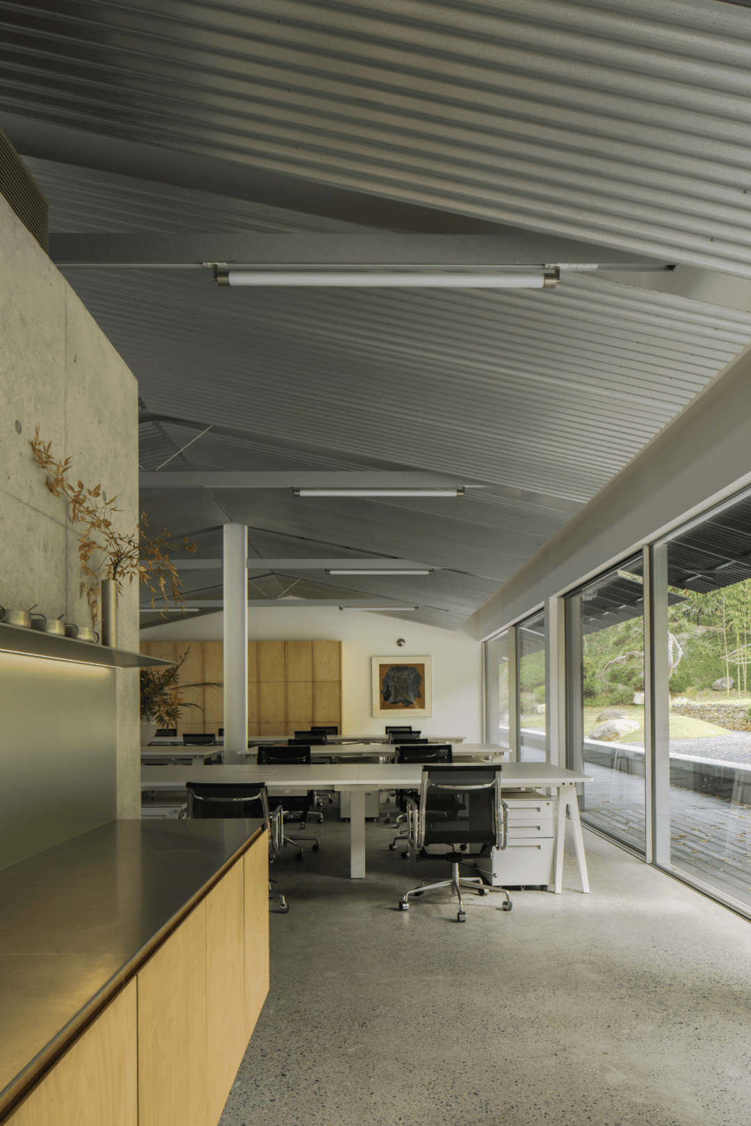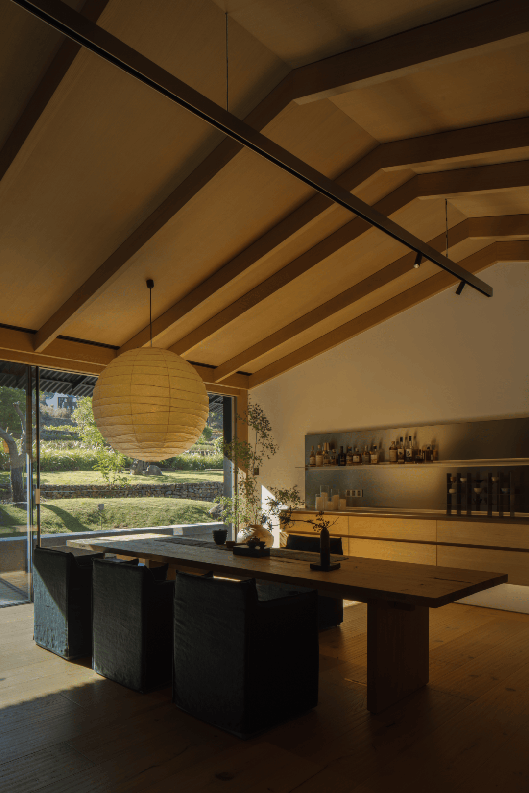公共区域被置于视野最佳的位置,与自然景观直接对话。水吧台功能单元被整合于公区一侧,这种布局支持多种交流与使用场景,无论是工作间隙的短暂休息交流,还是正式的商务洽谈,都能在这个空间中得到满足,促进了人与人之间的互动与沟通。