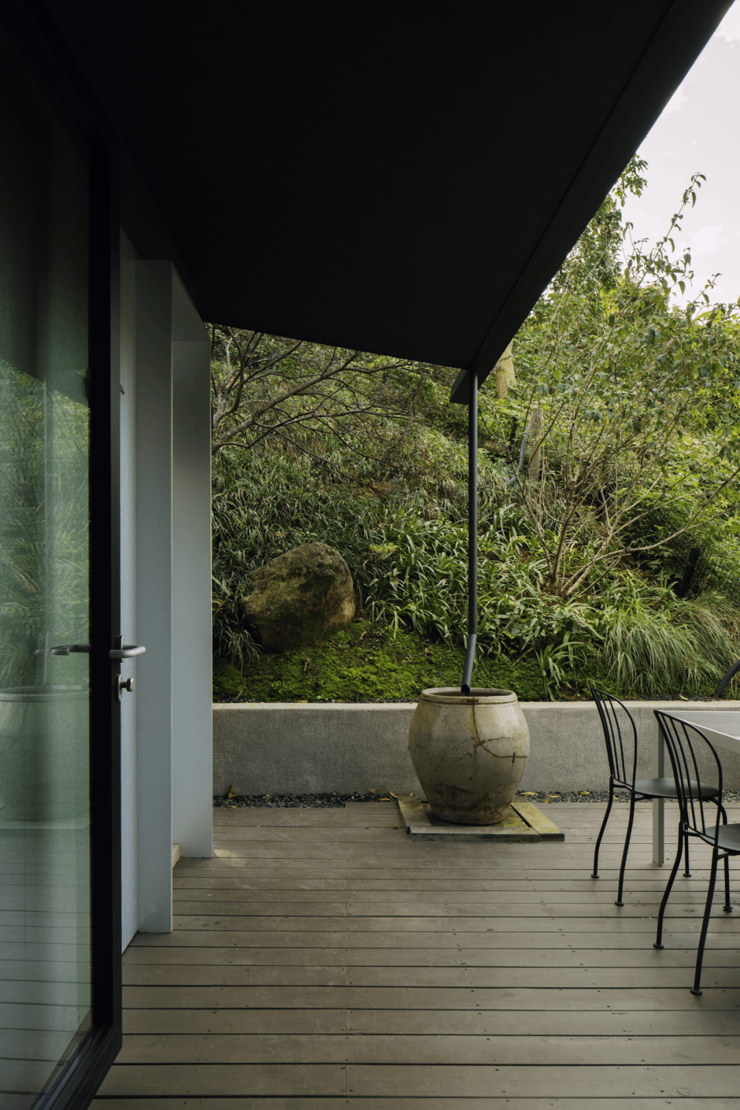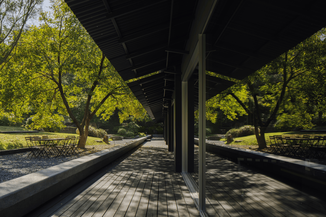 屋檐延续至室外,形成遮蔽与光影变化的边界。它不仅回应了不同天气条件下的使用需求,为人们提供了遮风挡雨的场所,还在视觉上延伸了建筑的体量感,增强了建筑的整体性。同时,屋檐下的光影变化引发了人们情感上的共鸣,让人在不同的时刻都能感受到建筑与自然互动带来的独特魅力。