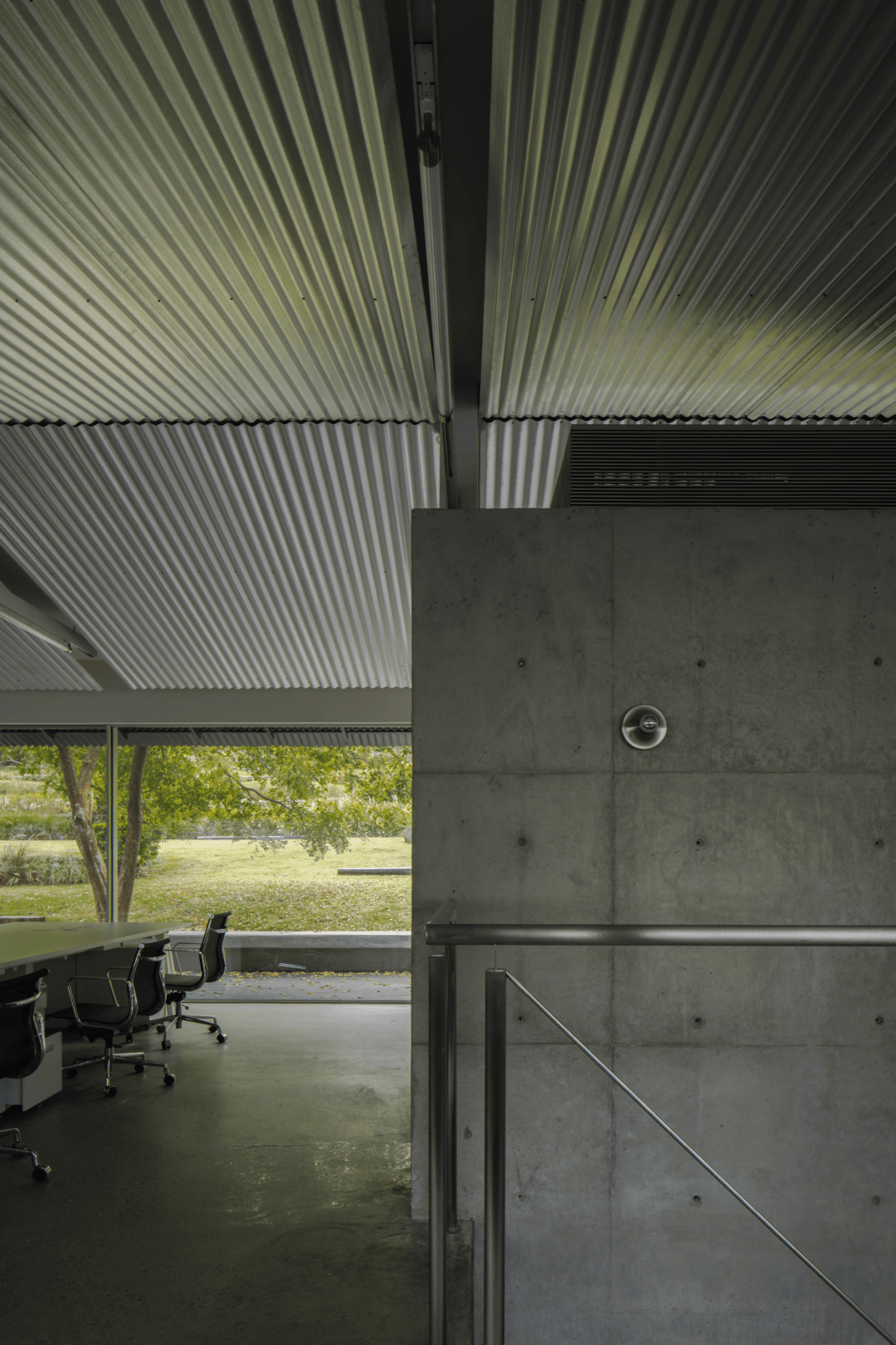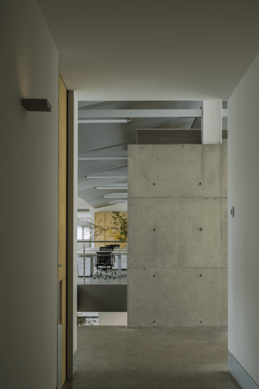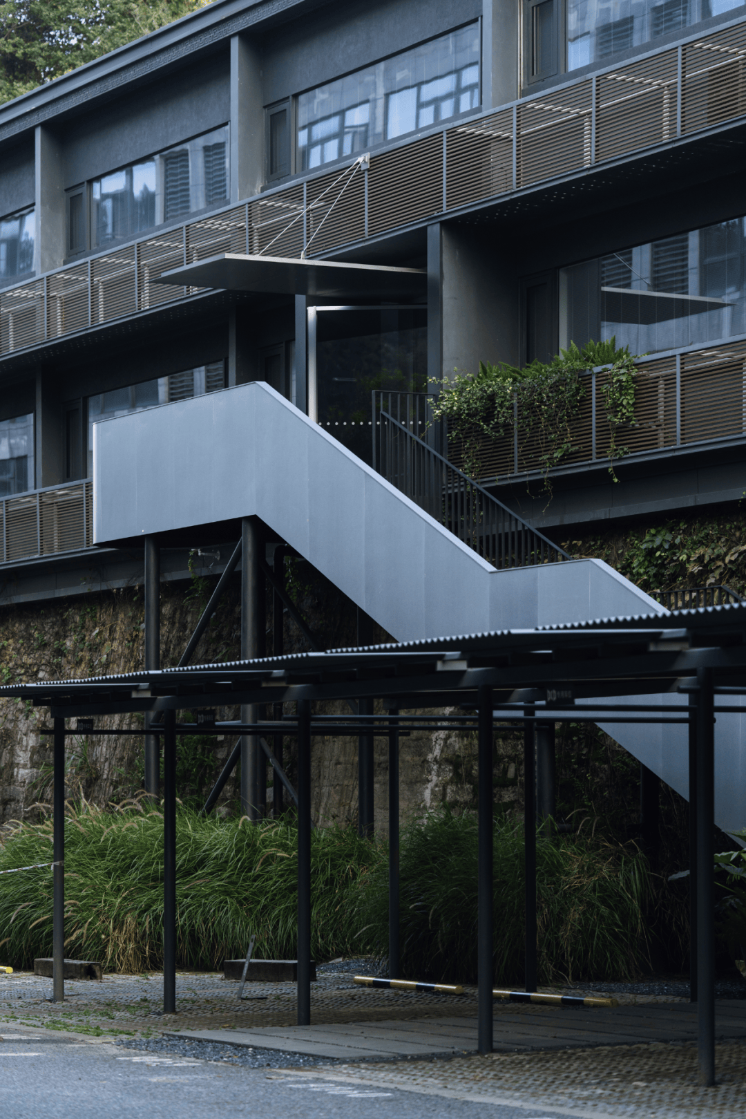 福州软件园坐落于大腹山、五凤山与科蹄山之间,山中林木繁茂,大成设计办公室便隐匿于这深浅交织的绿意之中。建筑依山而建,与山体共同围合出一片山谷,成为进入山谷的路径之一。从外部进入场地,建筑宛如山脚处的城楼,庄重而沉稳;车棚被组织成类似“长亭”的线性序列,巧妙地引导着行进方向,增强了进入过程的节奏感与仪式感,让人在踏入之初便感受到独特的氛围。