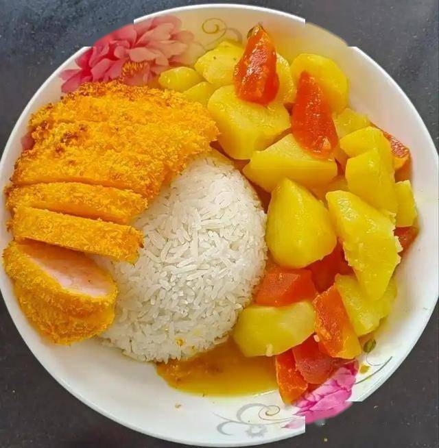 6. 米饭装入碗中,铺上煎好的虾排块,淋上煮好的咖喱汤汁,搅拌均匀,每一粒米饭都裹满咖喱,虾排外酥里嫩,好吃到停不下来。