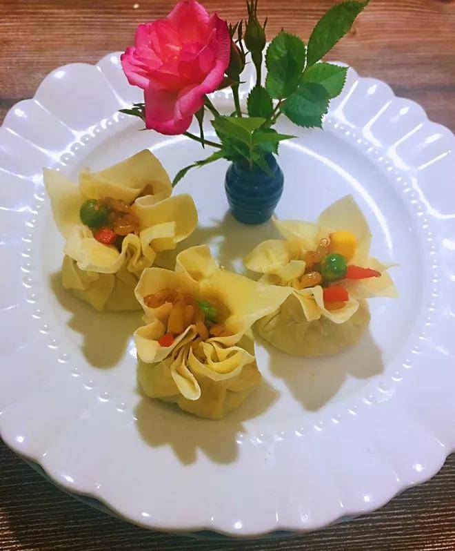 4、炸炉油温140°,放入做好的酥饺炸至金黄色捞起,摆盘即可。