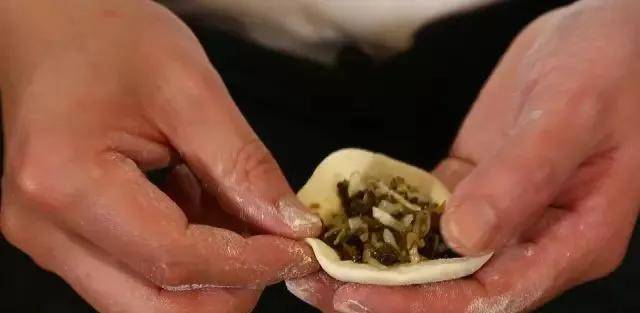 2. 把面团分成等量的剂子,搓圆压扁,用擀面杖擀圆,包入梅菜酱收口。