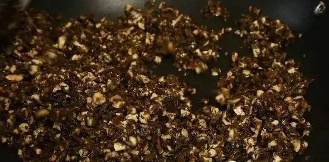 3,锅中加入少量底油,加入剁好的香菇和冬菜,香菇和冬菜的比例为2:3,小火煸炒3分钟。