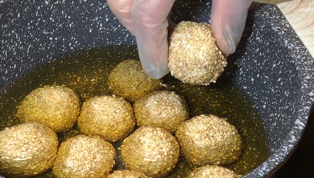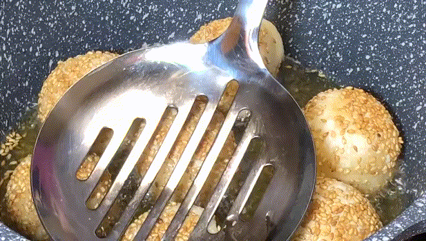6,炸到麻团浮起来以后,用铲子将麻团往下压。