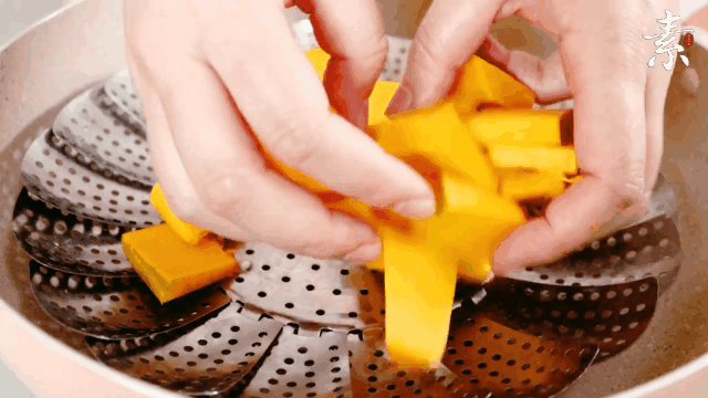1,红枣切碎,南瓜切片;南瓜上锅蒸熟,取出,加入白糖,压成泥。