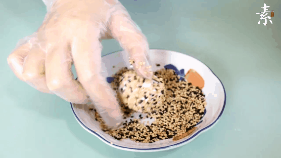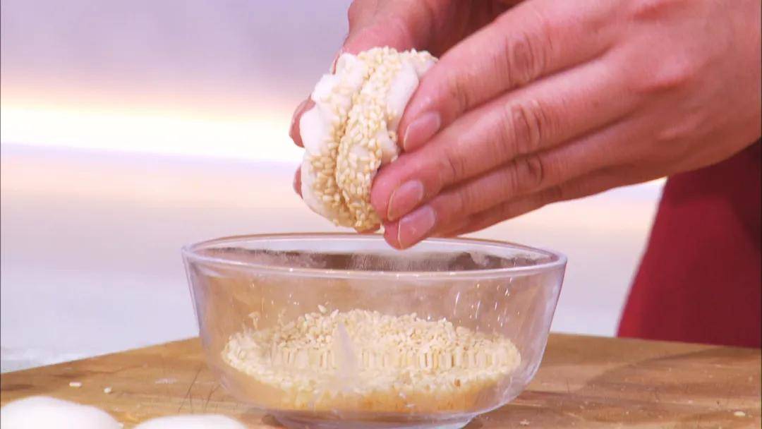5.滚上一层芝麻,压成饼状。