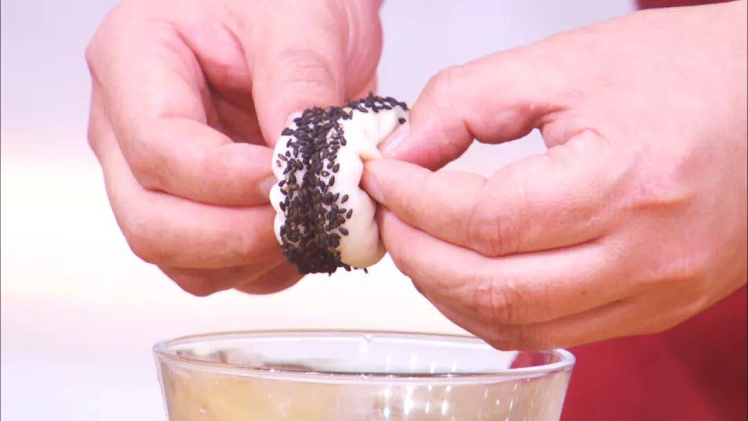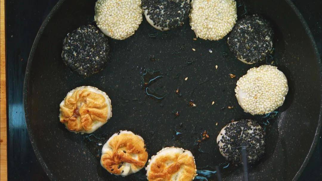 2:饼面抹上一层淡盐水,蘸上黑白芝麻。锅中少油,将饼入锅小火煎至两面金黄;