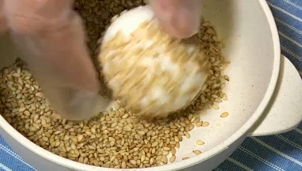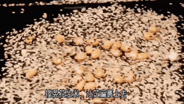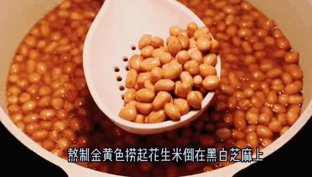 3,熬制金黄色捞起,把花生米倒在铺满黑、白芝麻的大盆上