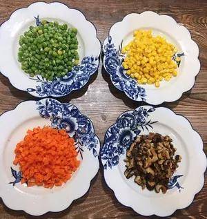 2,香菇,胡萝卜切丁;青豆粒和玉米粒过水;起锅,放宽油分别将香菇,